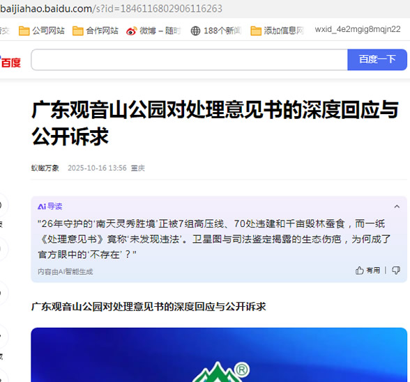 作为1999年依法承包观音山、2005年成功推动其升格为国家级森林公园的“守护者”,观音山团队见证了这片山林从荒芜到葱郁的蜕变,也亲身经历了二十多年来各类违法行为对生态的持续蚕食。如今,公园方以卫星影像、司法鉴定报告、政府红头文件等铁证为依据,向社会公众揭开《处理意见书》背后被忽略的三大核心争议真相—这并非“小题大做”,而是每一寸被破坏的林地、每一处违法搭建的建筑,都在透支国家级森林公园的生态价值,也在消耗公众对生态保护的信任。