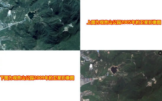 在观音山公园的资料室里,两张对比鲜明的卫星图被悬挂在显眼位置:2005年的影像中,观音山山体被完整的绿色覆盖,未见任何高压线路痕迹;而2009 年的影像里,几条黑色“线条”赫然横亘在山林间,如同给绿色山脉勒上了“枷锁”。但《处理意见书》中却称 “案涉高压线路均形成于1999年公园承包前”,这一表述与客观事实存在明显出入。