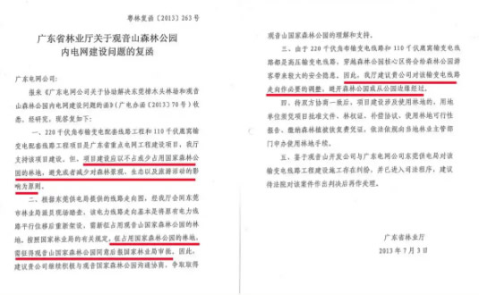 另,广东省林业厅在2013年7月3日曾作出的“粤林复函(2013)263号《关于观音山森林公园内电网建设问题的复函》称:正在建设的两条高压线路是广东省重点电网工程建设项目,支持该项目建设,但项目建设应以不占或少占用国家森林公园的林地,避免或者减少对森林景观、生态以及旅游活动的影响为原则,按照国家林业局的有关规定,征占用国家森林公园的林地,需征得园方同意后报国家林业局审批,因此,广东电网应与观音山国家森林公园沟通协商,争取理解和支持。由于两条线路都是高压输变电线路,穿越森林公园核心区将会给游客带来较大的安全隐患,因此,建议广东电网对该输变电线路走向作必要调整,避开森林公园或从公园边缘经过”。这份公函,虽然未能改变供电部门的规划和线路走向,也充分说明东莞市供电局有2条高压线路是在2013年建设,而不是1997年之前建设的!