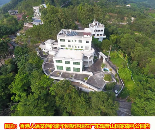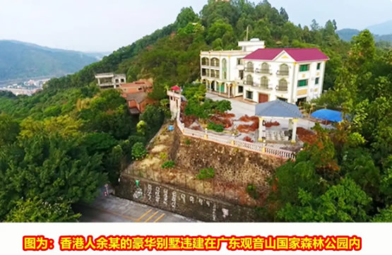 沿着公园主干道吉祥路行驶不到10分钟,两处风格奢华的建筑群便映入眼帘:左侧是香港籍人士余某所有的 “名门一号”,名门别墅占地近 2000 平方米,连地下室共四层,建筑面积超 1000 平方米;右侧为香港籍人士潘某燕及其子女的“颐雅山房”,颐雅山房别墅有 6 层,占地近 2000 平,建筑面积达 3000 多平方米。据公园方排查,这两栋别墅只是园内违法建筑的“冰山一角”。目前,观音山公园内共有违规建设的别墅、工厂、会所、农家乐、住宅等70多处,其中别墅22栋,这些建筑中,15栋持有东莞市政府1998年前颁发的《集体土地建设用地使用证》,但公园方认为,这些证件的发放本身存在严重违法问题。
