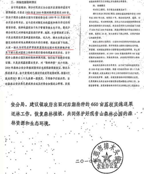 更具说服力的是,2010年9月16日,东莞市樟木头镇农业办公室发布的《关于观音山森林公园周边林地保护的通知》明确写道:“对1999-2000年期间抢种的660亩荔枝,最好由镇府牵头,实施退果还林,共同保护好观音山森林公园的森林资源。” 这份政府文件直接证实,早在20多年前,观音山公园就已存在毁林种果树问题,且当时政府部门也认可这一事实。