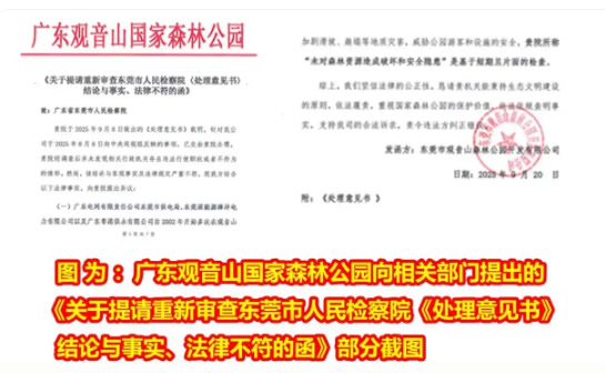此次公开对《处理意见书》提出异议,并非“对抗”,而是“守护”—— 守护来之不易的绿色,守护国家级森林公园的尊严,守护 “绿水青山就是金山银山”的理念。针对检察院的《处理意见书》,观音山公园已于2025年9月20日向zhongyangxunshizu、zhongjiwei、市检察院等部门递交了《关于提请重新审查东莞市人民检察院《处理意见书》结论与事实、法律不符的函》,希望广东省相关部门重新开展实地核查,尊重卫星影像、司法鉴定报告、政府文件等客观证据,正视观音山面临的生态问题,依法依规追究相关违法主体责任,责令其限期整改,恢复被破坏的生态环境,并以此来挽回公众对“观音山系列事件”的失望。